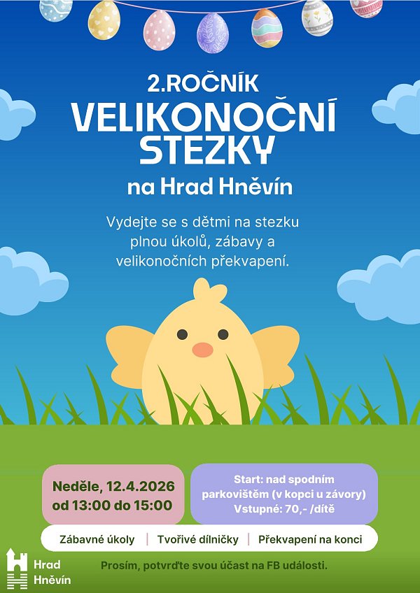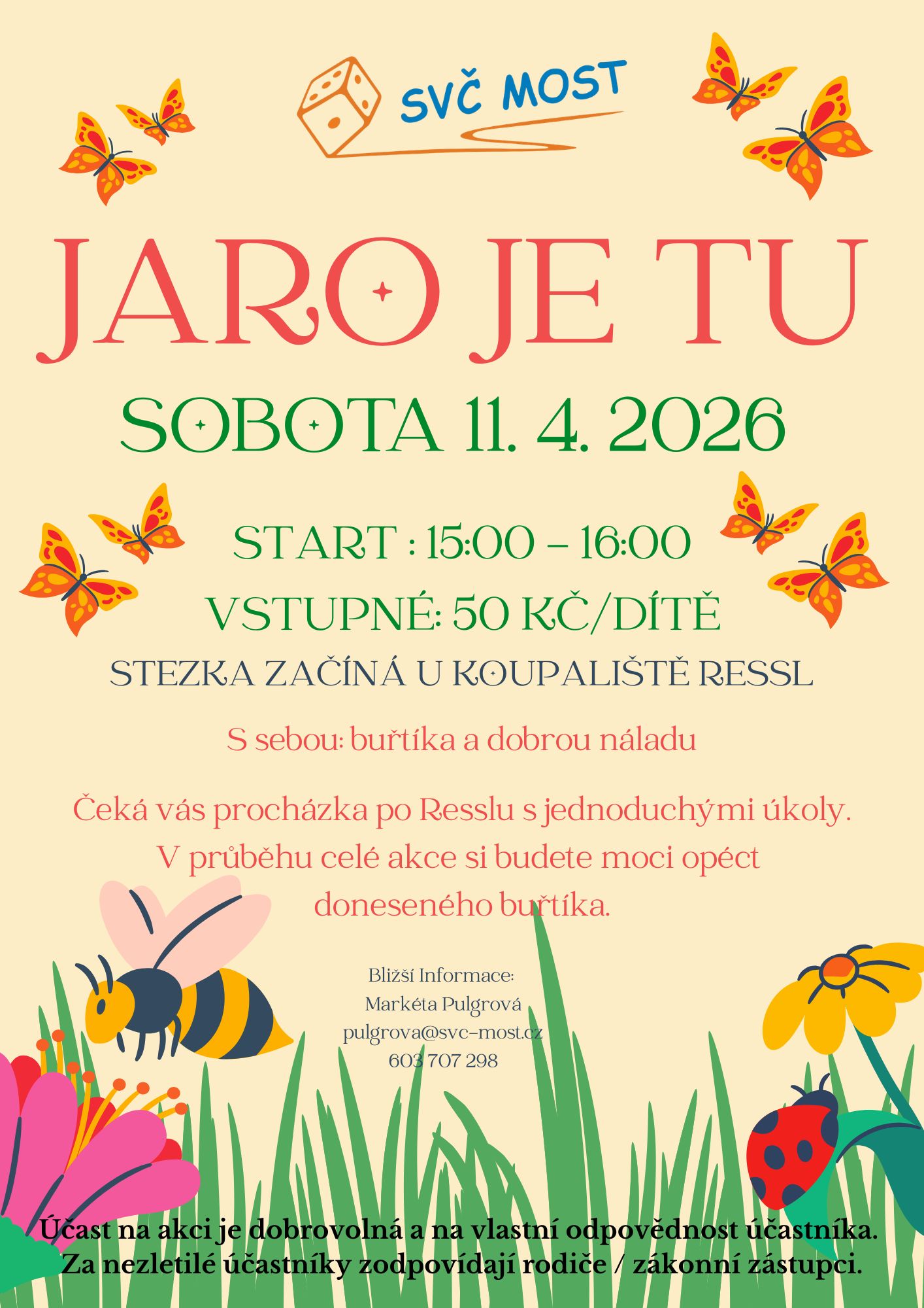 Jaro je tu 11. 4. 2026 15:00, Ressl Akce pro děti Jarní procházka na Resslu s úkoly, opékání (vlastních) buřtů. Vstupné: 50 Kč/dítě | |