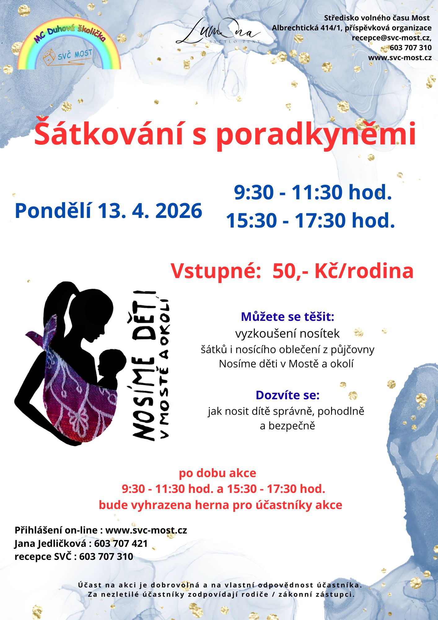 | Šátkování s poradkyněmi 13. 4 .2026, MC Duhová školička Ostatní Vyzkoušíte si, jak správně, pohodlně a bezpečně nosit nosítka, šátky i nosící oblečení. Vstupné: 50 Kč/rodina | |