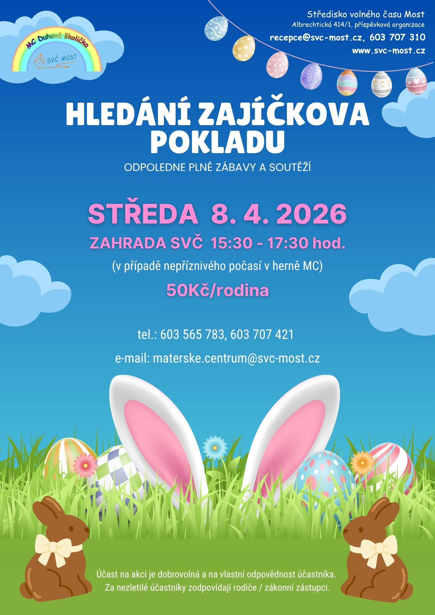 | Hledání zajíčkova pokladu 8. 4. 2026 15:30 - 17:30, MC Duhová školička Akce pro děti Odpoledne plné zábavy, her a pohybových aktivit pro nejmenší. Vstupné: 50 Kč/rodina | |
